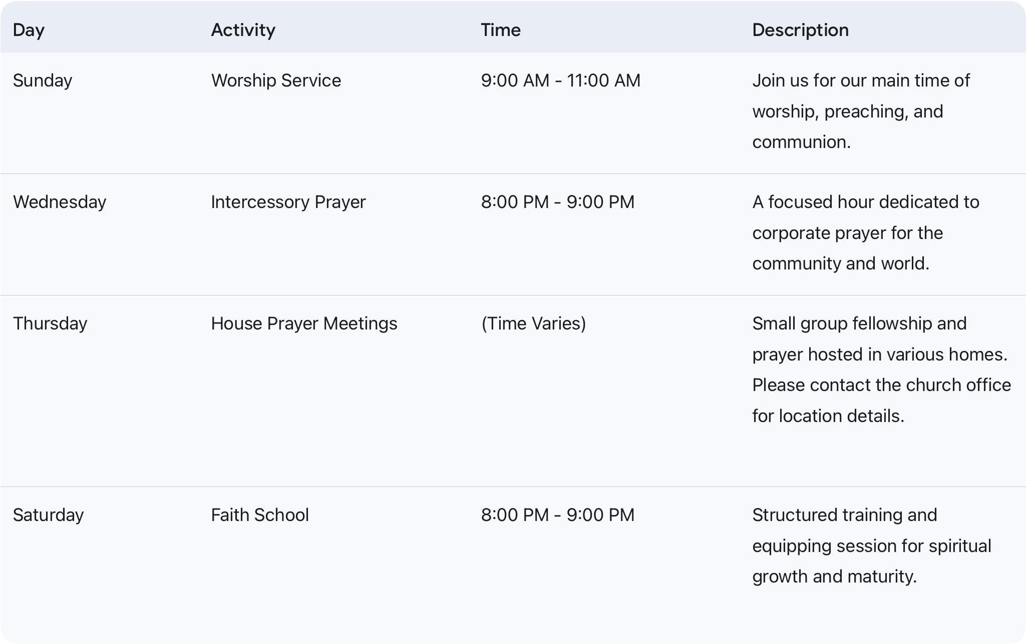 Faith School | 8:00 PM - 9:00 PM | Structured training and equipping session for spiritual growth and maturity. |
